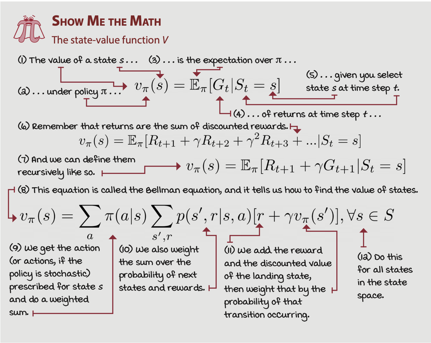 - state-value-function은 V로 표기하며 어떤 state의 가치를 표현한다.(지금부터 기대되는 return)