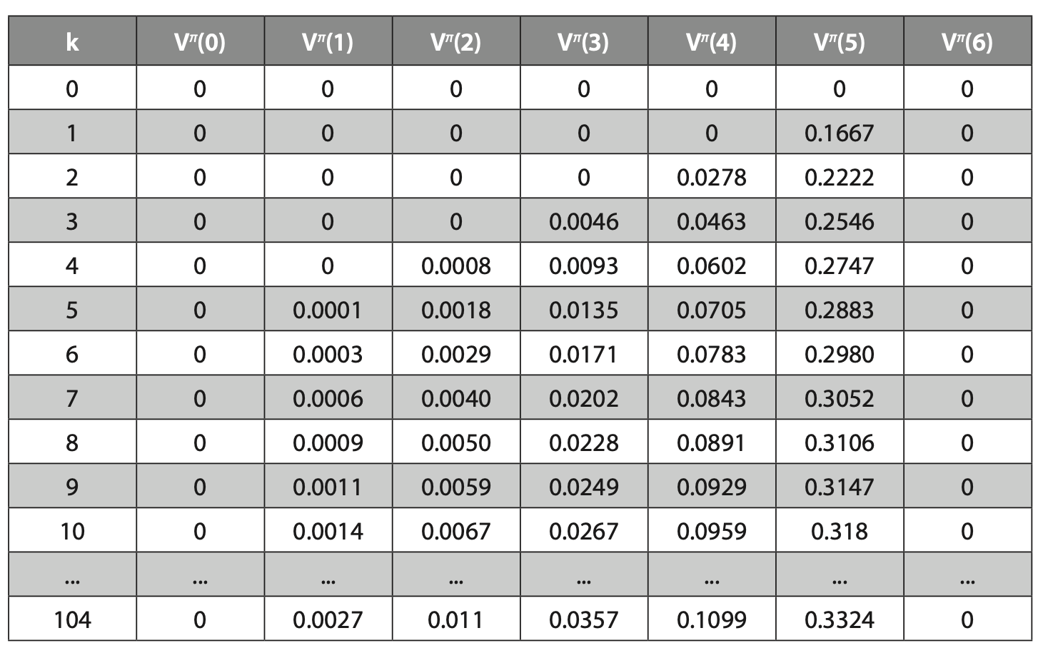 - state 5를 예시로 봤을 때 해당 state에서는 다음 state로 4,5,6을 가질 수 있다. 다음 state들의 value를 이용해 현재 state를 갱신한다. → 처음 모든 state의 value를 0으로 둔 상태에서 반복적으로 state value를 갱신하는 것이기 때문에 state 6을 제외한 나머지 state value들은 모두 0이다.