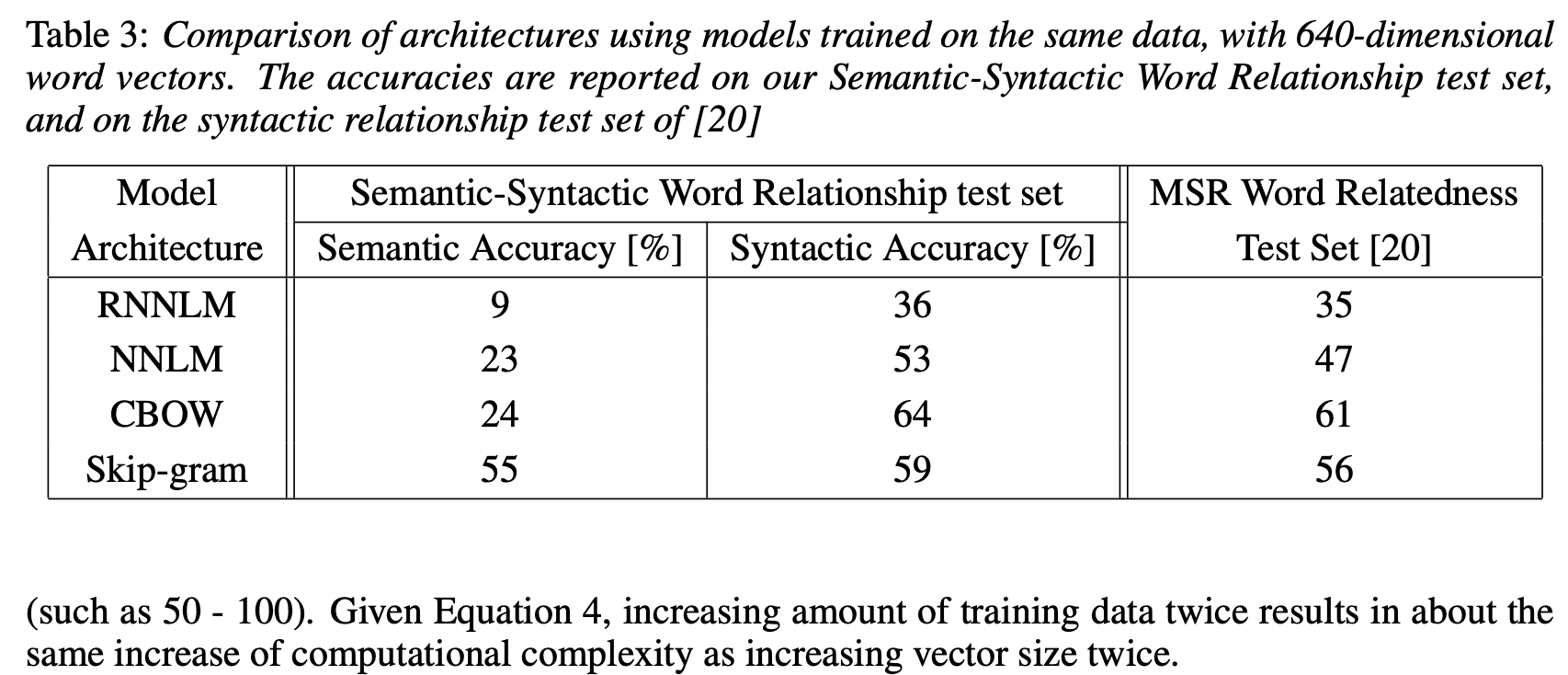word vector를 학습하기 위해 Google 뉴스 말뭉치를 사용했다. 이 말뭉치에는 약 6억 개의 토큰. 어휘의 크기는 가장 빈번한 단어 100만 개로 제한했다. 더 높은 차원의 word vector를 사용하면 정확도가 향상될 것으로 예상한다.