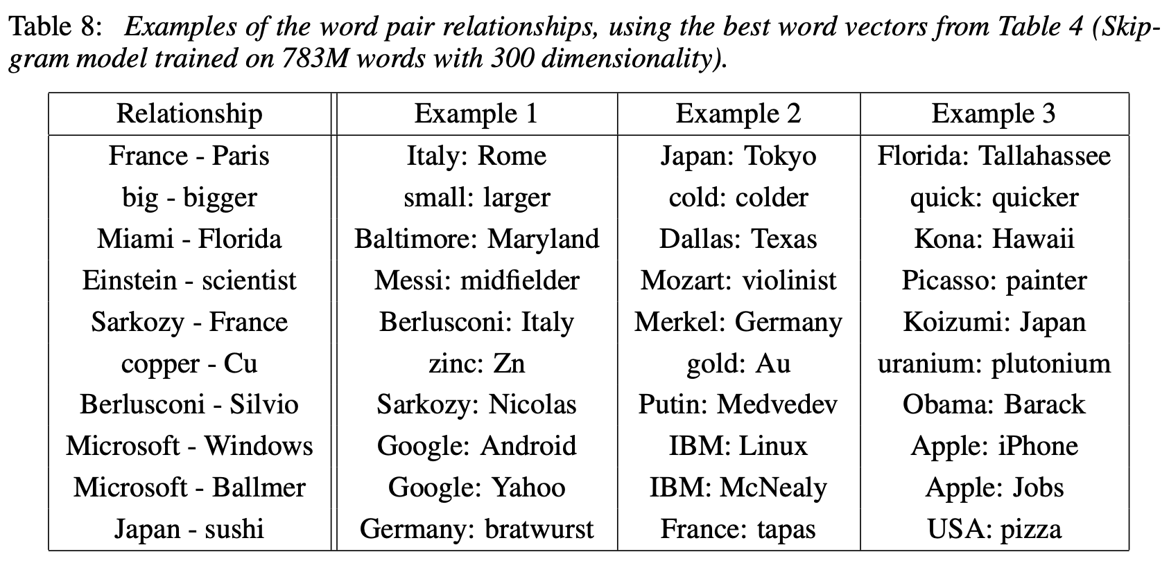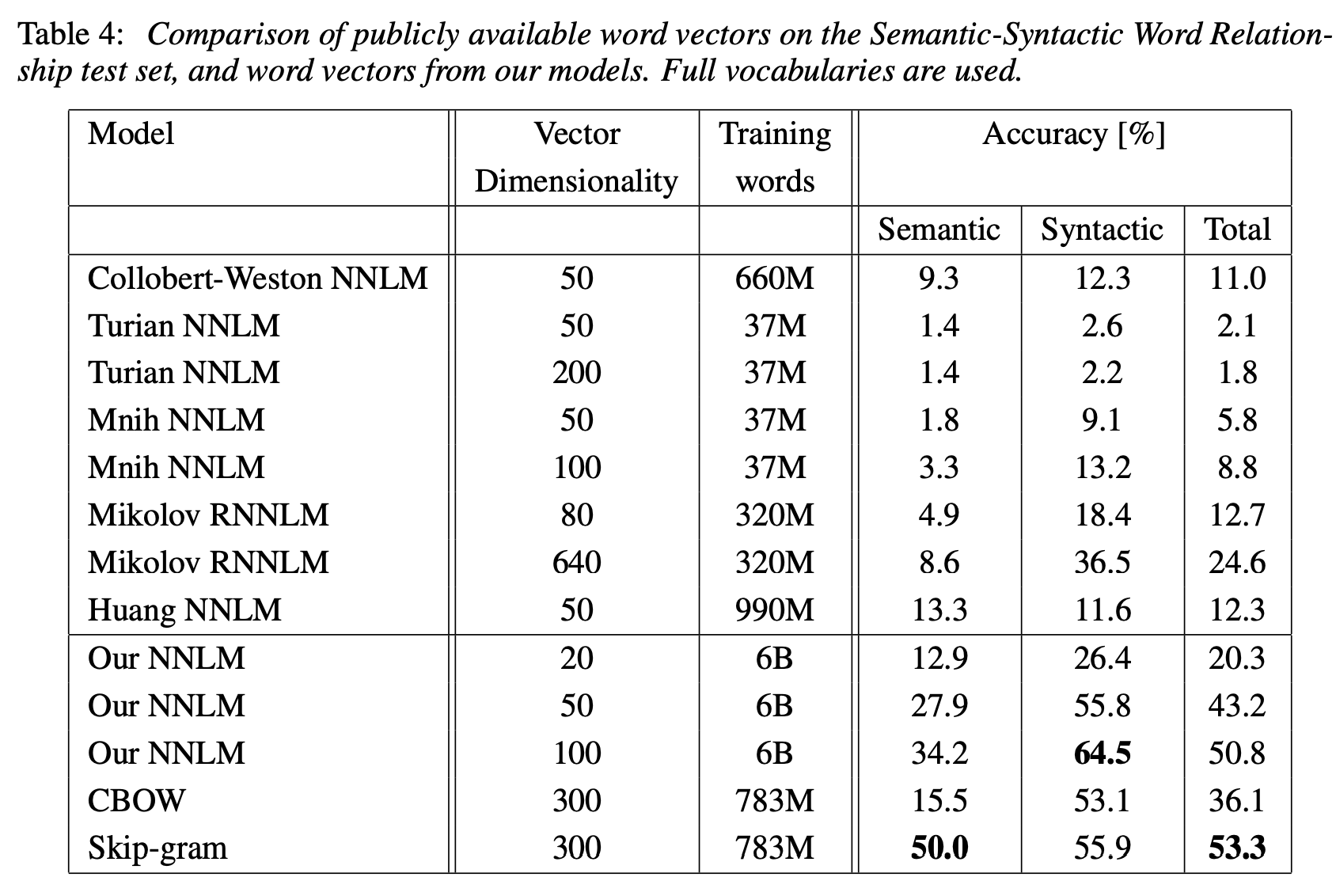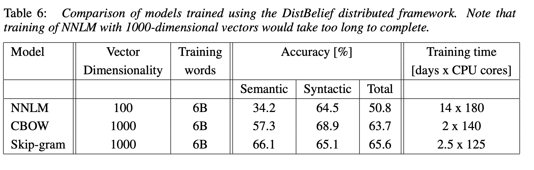 이전 연구들에서는 word vector의 quality를 비교할 때 직관적으로 이해가 되는 가장 비슷한 단어를 테이블로 보여줬다.