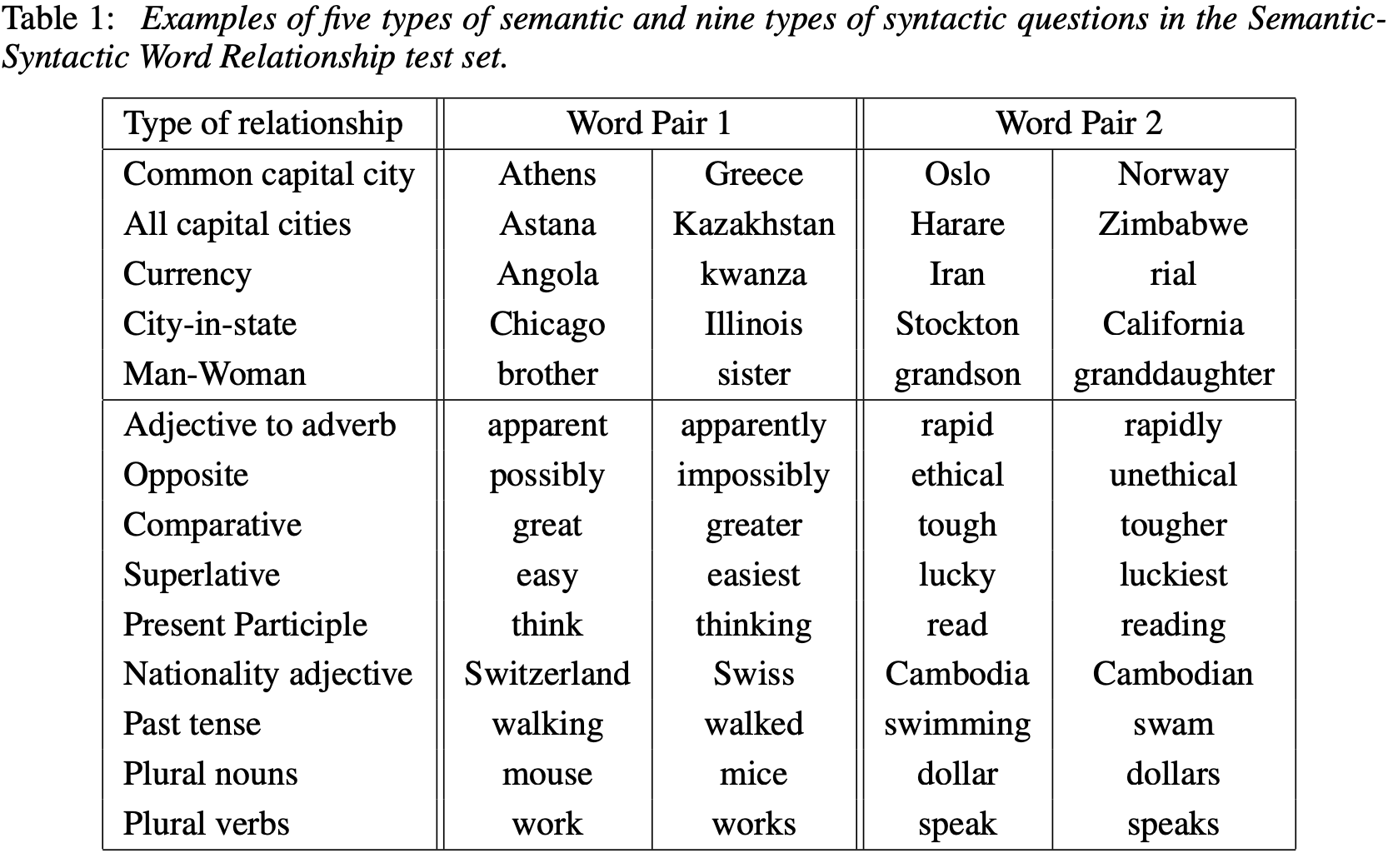 word vector의 quality를 측정하기 위하여, 5개의 type의 의미적인 질의로 구성된 comprehensive test를 정의하였다. 두개의 type에 대한 예시는 아래 테이블에서 확인 할 수 있다. 8869개의 의미적인 질의와 10675개의 문법적인 질의로 이루어져있다.