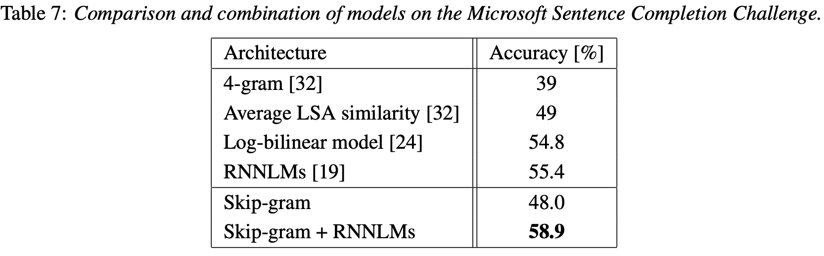 Microsoft Sentence Completion Challenge는 최근에 소개된 advancing LM과 다른 NLP 기술에 대한 task이다. 해당 task는 1040개의 문장으로 구성되어 있으며 문장은 하나의 단어가 빠져있고 목표는 가장 일관성있는 단어를 선택하는 것이다.
