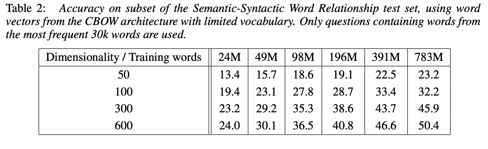 좋은 모델 아키텍처를 찾기 위해 먼저 training set의 sub set에 대해 학습을 진행했다. sub set은 가장 빈번한 30만개의 단어로 모델을 평가했다. word vector 차원을 다르게 선택하고 훈련 데이터의 양을 늘린 CBOW 아키텍처를 사용한 결과는 아래 표와 같다.