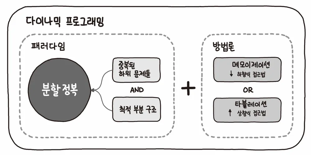 DP는 기본적으로 문제를 나누고 그 문제의 결과 값을 재활용해서 전체 답을 구한다. 그래서 동일한 작은 문제들이 반복하여 나타나는 경우에 사용이 가능하다.