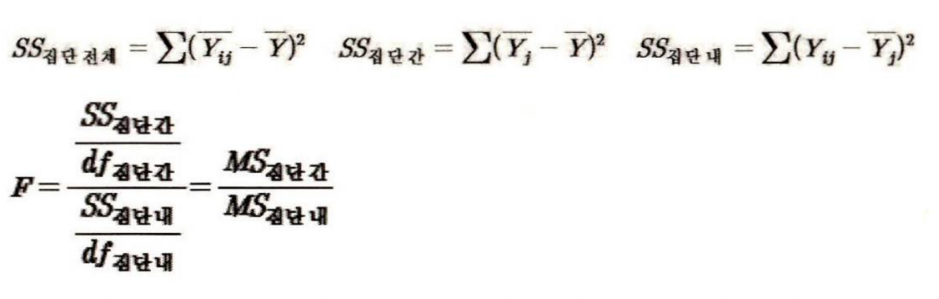F는 집단간의 차이가 없다면 집단 간 분산과 집단 내 분산이 같다는 의미이고 집단 내 분산이 집단 간 분산보다 클수록 각 집단은 차이가 있다고 간주한다.