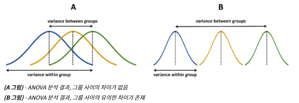 분산분석은 F값을 통해 검정하는데 집단 간 분산(변화량 혹은 변량)과 집단 내 분산과의 관계를 통해 계산한다.