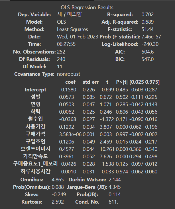 ols(formula='재구매의향 ~ 성별+연령+학력+월수입+사용기간+구매가격+구입조언+브랜드이미지+가격만족도+구매중요도1_메모리+하루사용시간', data=df).fit().summary()