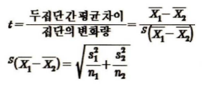X₁와 X₂는 각각 집단 1과 집단 2의 평균이고 s(X₁- X₂)에서 s는 표준오차이며, 따라서 s(X₁- X₂)공식에서는 n₁과 n₂는 각 표본의 크기를 나타낸다. 이 때 s(X₁- X₂)공식에서는 각 표본의 크기를 나타낸다. 즉 분산을 각 집단의 크기로 나눈 후 합산한 값에 루트를 씌운 것으로 이해할 수 있음