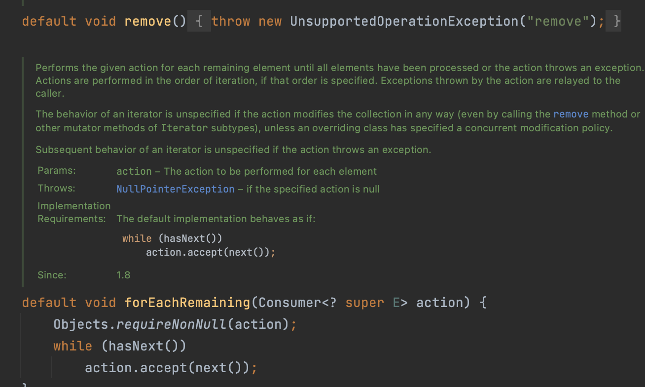 Java 8 혹은 그 이상의 버전에서는 iterator 타입의 forEachRemaining 메소드를 활용하면 List를 채울 수 있다. forEachRemaining 메소드의 참조로 add() 메소드를 전달하면 해당 iterator 인스턴스의 제네릭 타입의 value를 add하게 된다.
