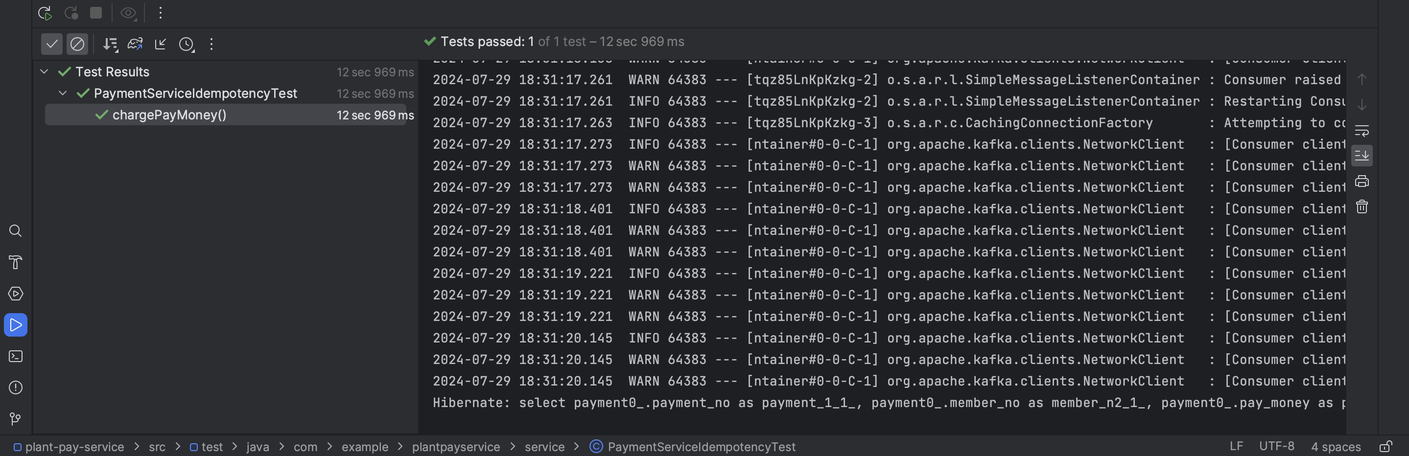 SAGA 패턴을 사용하여 분산 트랜잭션을 제어합니다.CDC(Change Data Capture) + Outbox 패턴을 적용하여 이벤트 유실을 방지합니다.try 블록 마지막에 수행한다면, 중복 요청 시 발생하는 예외가 catch 블록에 잡히게 됩니다.SAGA 패턴의 정확한 수행과 중복 요청 방지의 중요성을 고려할 때, 이 방식이 tradePayMoney 메서드에서는 더 적절한 선택이라고 판단했습니다중복 요청이 여러 번(1000번) 동시에 들어왔을 때 CountDownLatch 와 ExecutorService 를 통해서 잘 동작하는지 테스트해보도록 하겠습니다!