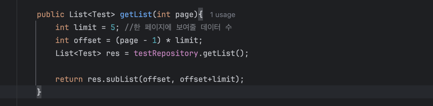 단순히 페이지 수와 전송할 데이터의 수만 정하고 서비스레이어에서 계산을하고 응답을 하는 방식으로 구현했다