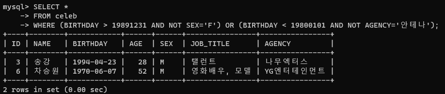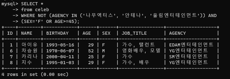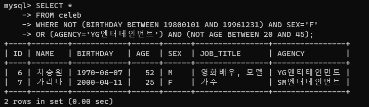 그리고 영화배우 혹은 텔런트가 아닌 연예인을 검색하는 것이니 NOT을 사용합니다.