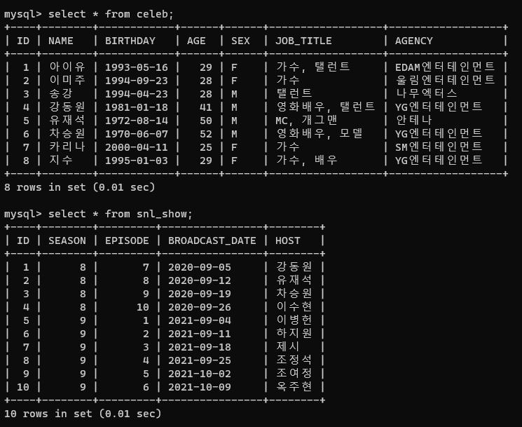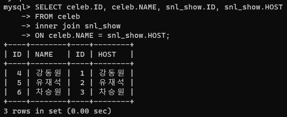 이번에는 snl_show의 모든 ID, 호스트 데이터를 갖고 온 것을 볼 수 있습니다.