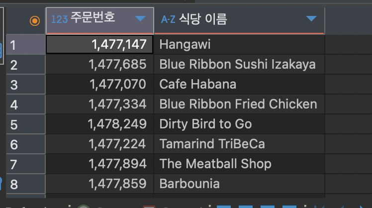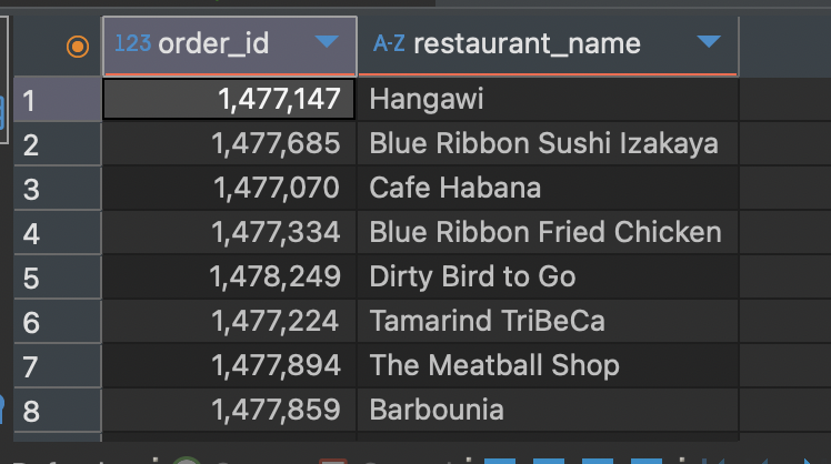 여기서, order_id, restaurant_name 컬럼을 조회하는 SQL의 실행결과를 살펴보겠습니다.