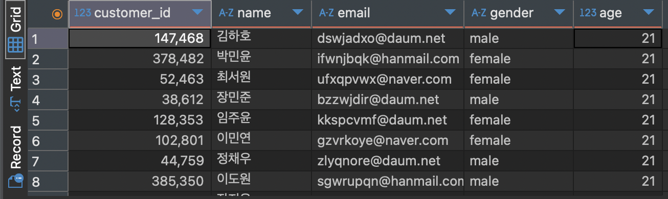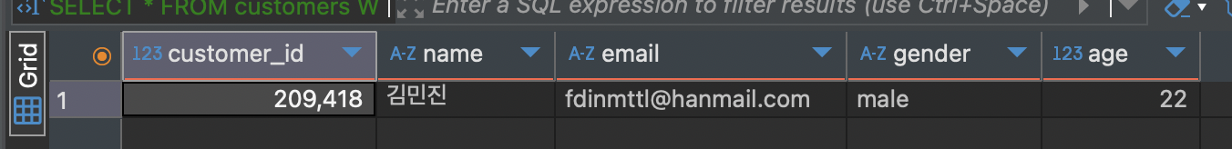 이제 예시를 들어서, 손님 중에 나이가 21살인 사람을 필터링하는 SQL문을 작성해보겠습니다.
