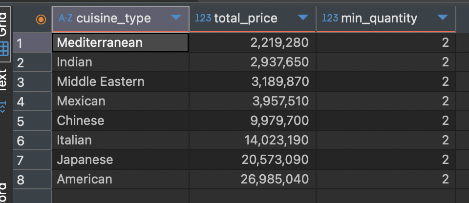 SELECT cuisine_type, SUM(price * quantity) as total_price