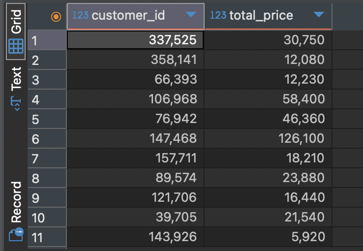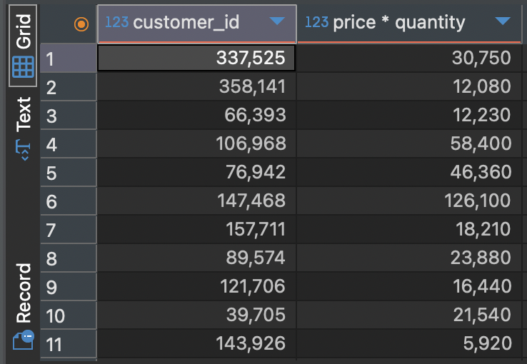 SELECT customer_id, price * quantity -- price와 quantity를 곱해서 총 주문 금액을 조회