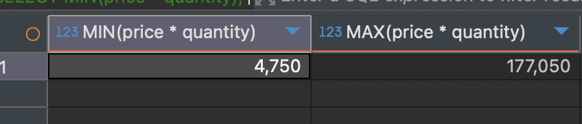 SELECT MIN(price * quantity), MAX(price * quantity) -- 총 주문 금액의 최소, 최대