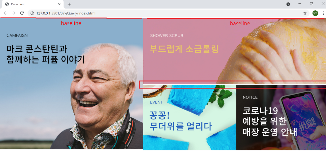 | 그럼 '부드럽게 소금롤링' 이라는 이미지가 부모인 <div>엘리먼트의 baseline에 맞춰 정렬된다.그렇게 되면 <div>영역이 조금 남게 되는데 때문에 당연히 밑에 이미지들이 내려오는 것이다. |