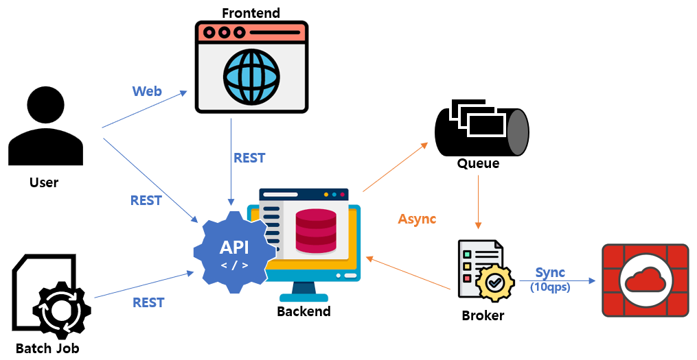 앞서 이야기 했다시피 본 서비스는 LBaaS 와 유사한 구조를 갖게 되었다. 다른점이라면 컨트롤 해야 하는 대상 장비의 수는 현저히 적다는 것과, 대상 장비의 관리 CPU 가 현저히 좋지 않았다는 점이다. CPU Load 가 높은 상태로 유지되면 Web Console 접속이나 API를 이용한 접근이 불가해지기 때문에 API call에 Throttling 을 추가하였다. (기억으로는 10 qps 로 하였다). Backend 에서 Broker 로의 메시지는 1개라 하여도 Broker 에서 장비로의 API call 은 여러개가 될 수 있다. 이 부분에 대한 Throttling 을 추가하였다고 보면 좋을 것 같다.