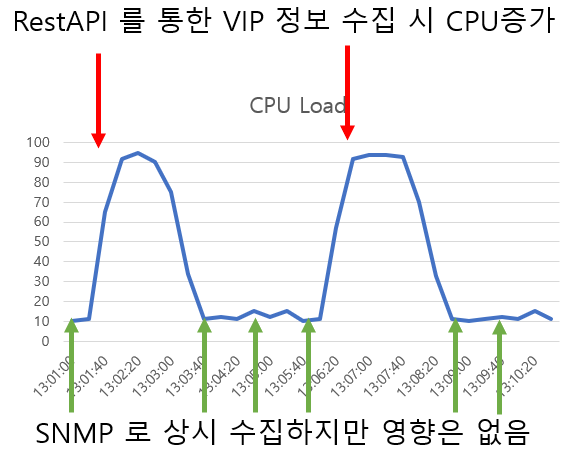 Rest API 를 이용하여 VIP 의 SNMP List 정보를 획득한 후 한정된 OID 값을 이용하여 VIP Getbulk 를 통한 데이터 획득을 하여 CPU Load 도 줄이고, 획득 주기를 5분에서 1분으로 줄여 VIP down 으로 인한 장애 확인의 민감도를 올렸다.