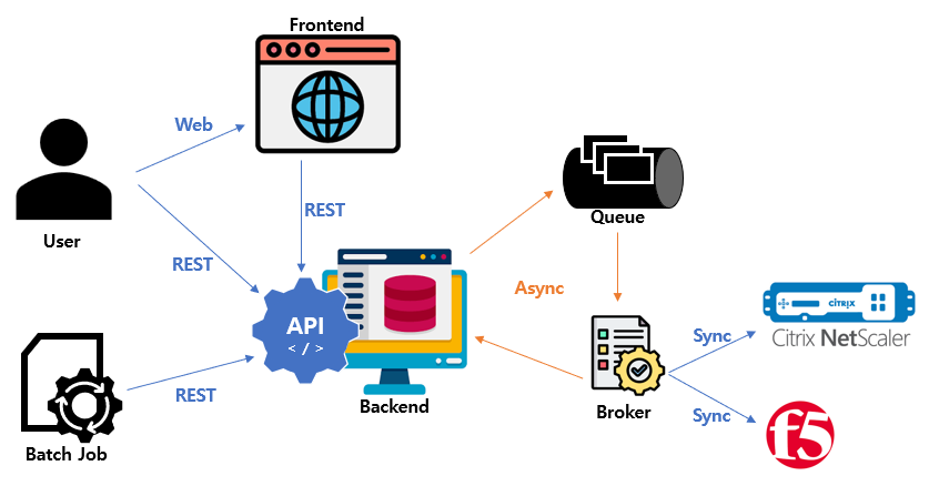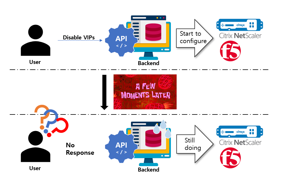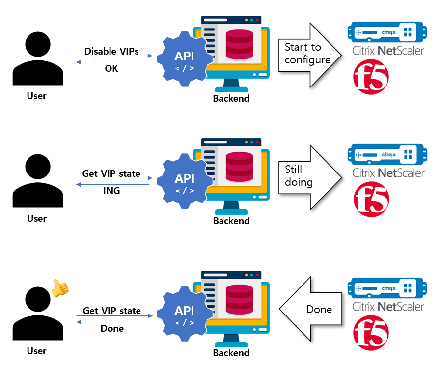 또한, 관리할 LB 장비 대수가 많아지고 Sync 동작으로 실행되는 Backend 특성상 여러 VIP 에 대한 제어를 할 경우 유저는 Web 혹은 API 에서 명령을 내린 후 한참을 기다려야 하는 일이 발생하게 되었다.