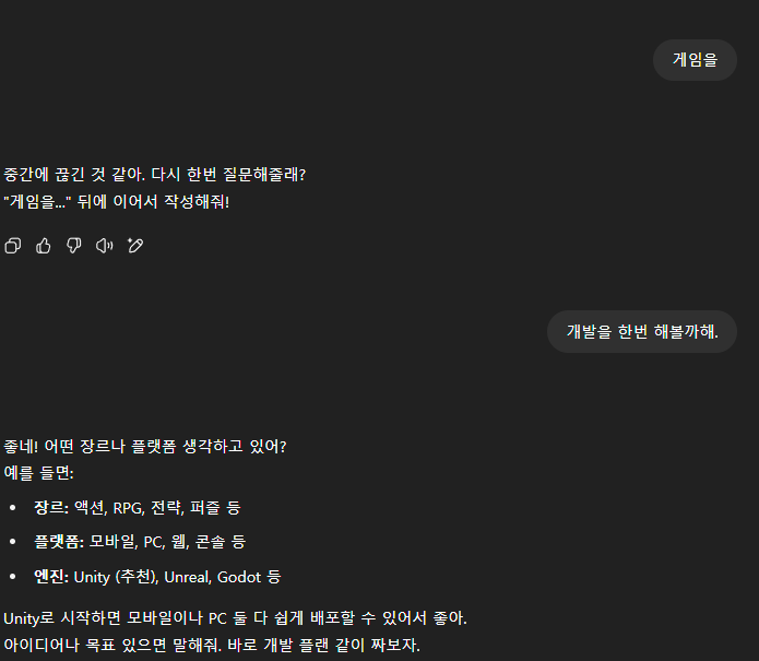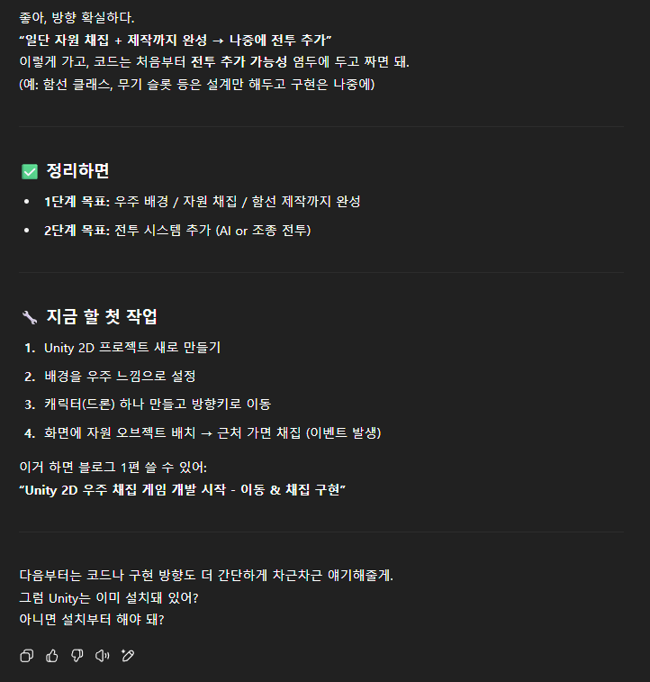 참고로 나는 Unity 도 실질적으로는 처음 만지는 것과 다름 없고, C# 은 해본적이 거의 없다. 따라서 나는 ChatGPT 에게 내 몸을 이용해서 개발한다 생각하고 너는 나에게 어떤 설정을 해야하고 어떤 코드를 만들어야 할지를 또박또박 이야기 해줘야해 하고 이야기 하였다.