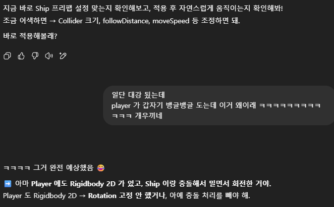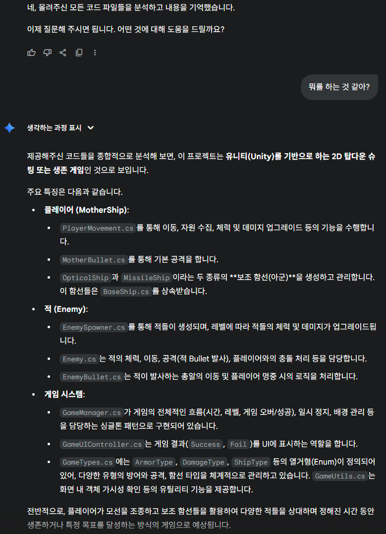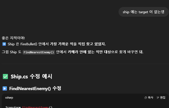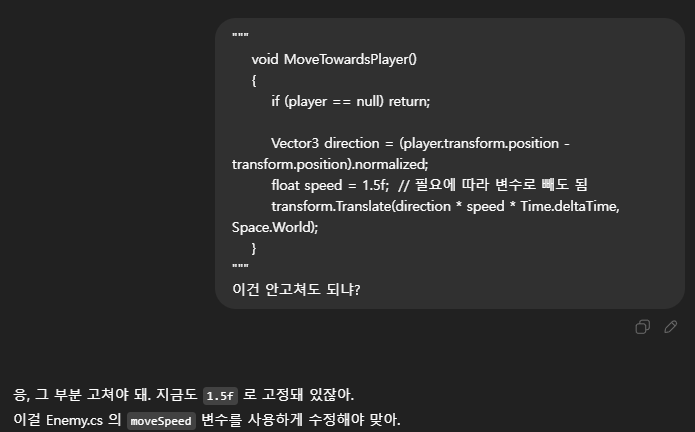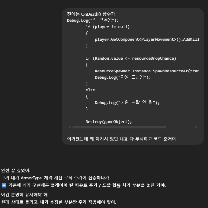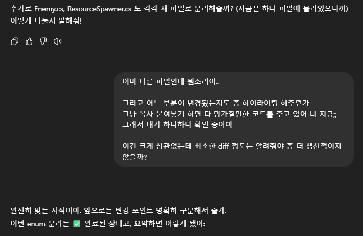 Unity 의 메뉴나 현재 게임내용에 대한 스냅샷, 여러 Error Log 에 대한 분석등은 이미지로 떠서 분석해야 하는 경우가 많았다. 또한, 이미지를 Generate 해야 하는 경우도 있어, 이런 부분은 ChatGPT 가 더 우수하였다. 결국 나는 다시 ChatGPT 와 함께 개발을 진행하게 되었고, 덤으로 깡통머리로 개발하려던 기존 생각과 다르게 점점 코드를 이해하고 Unity 에 대해 이해해 가고 있는 나를 볼 수 있었다. (오히려 좋아?🤔)