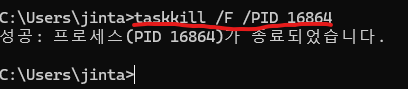 taskkill /F /PID 16864를 입력하니 성공적으로 종료되었다