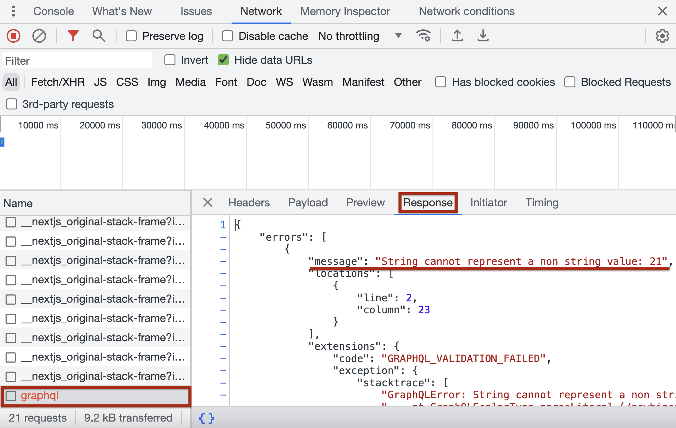 Response 탭을 누르면 에러 정보를 확인할 수 있다.