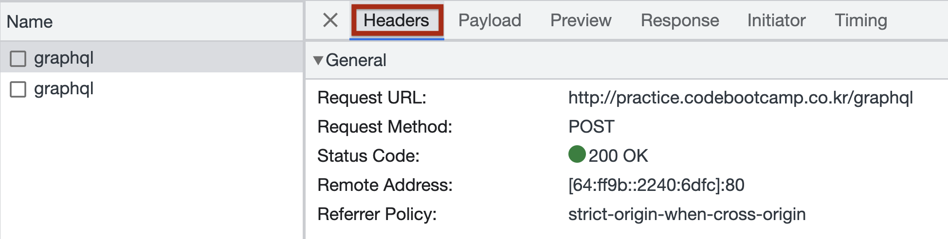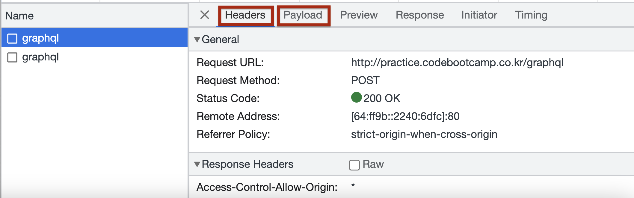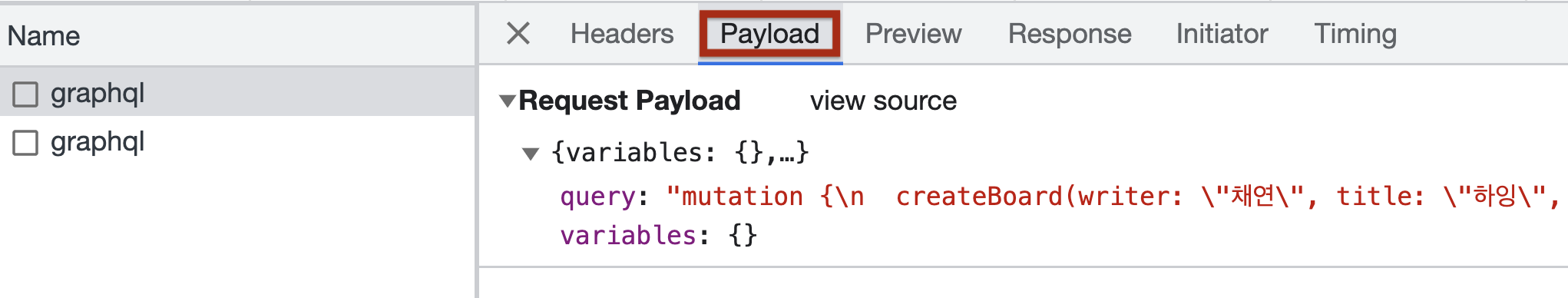 Payload는 내가 요청한 데이터를 볼 수 있다. 내가 요청한 데이터가 제대로 되어있는지 확인해볼 수 있다.