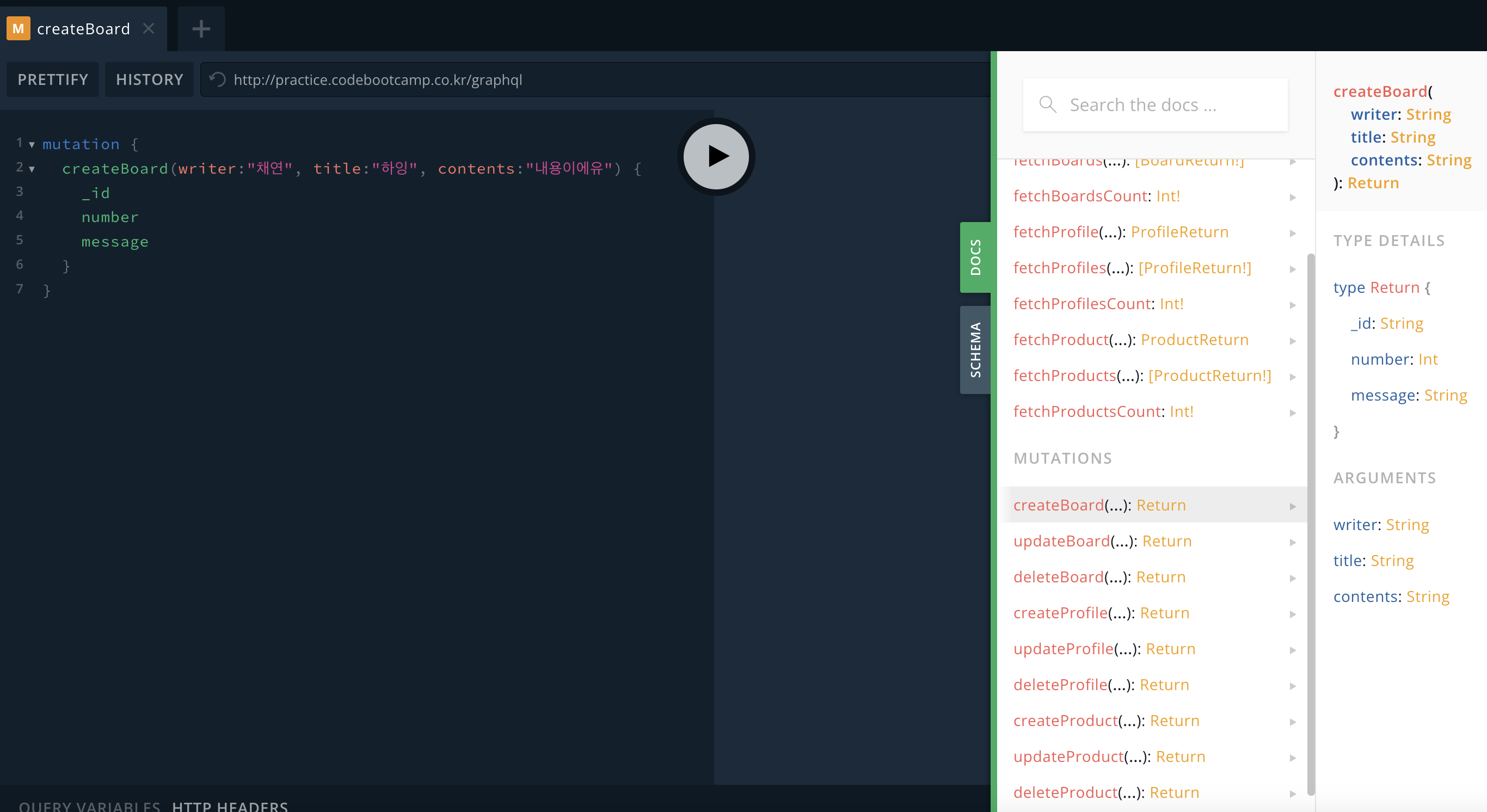 일부러 에러를 내기 위해 내 코드에서 writer 부분의 data type이 정수인 데이터로 createBoard를 해보겠다.