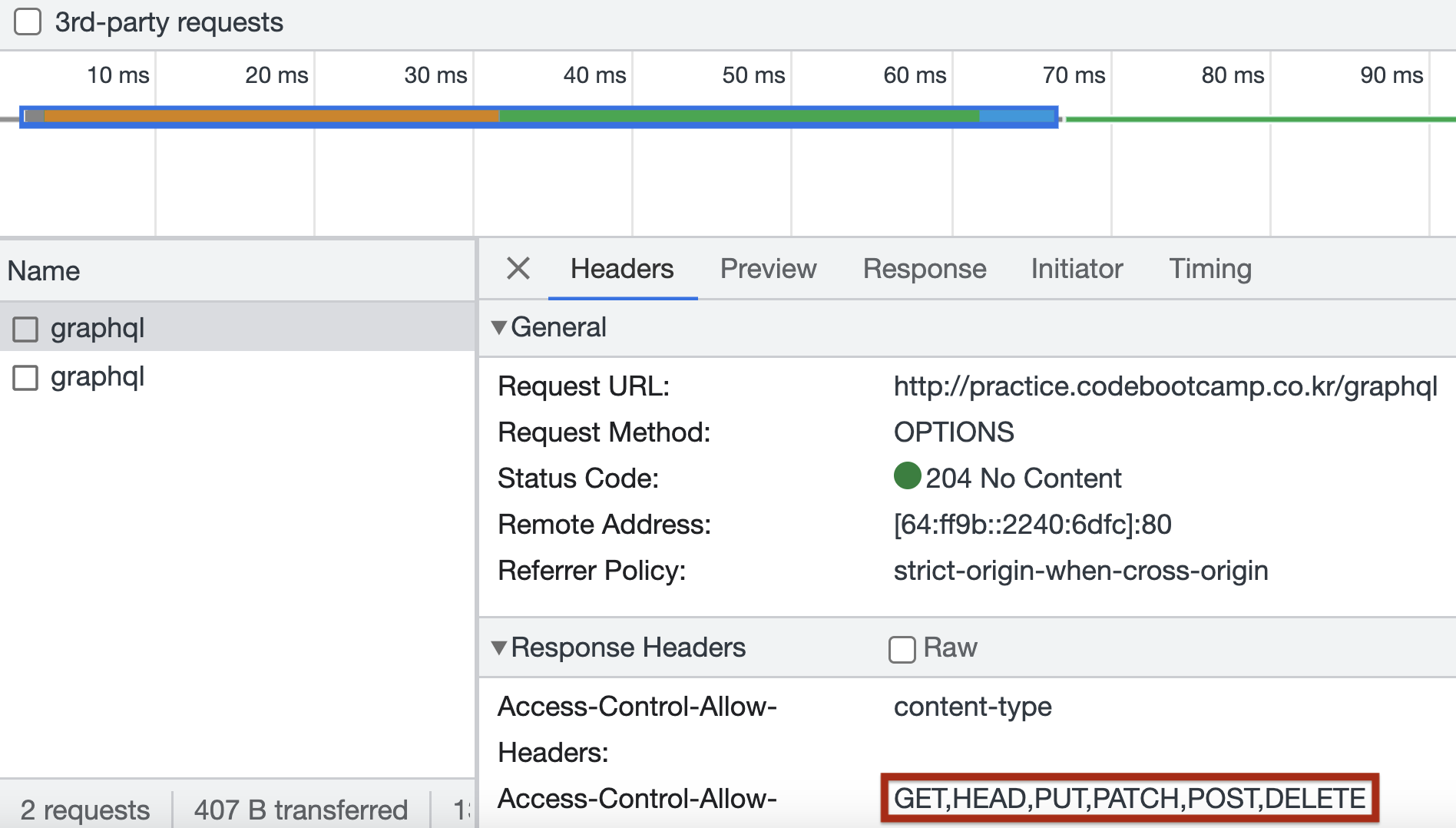 이때, Preflight이 가장 먼저 보이지 않는 경우는 크롬 브라우저가 잘못 보여주고 있기 때문이고 원래는 Preflight이 가장 먼저 실행되고 그 다음에 실제 요청을 하게된다.