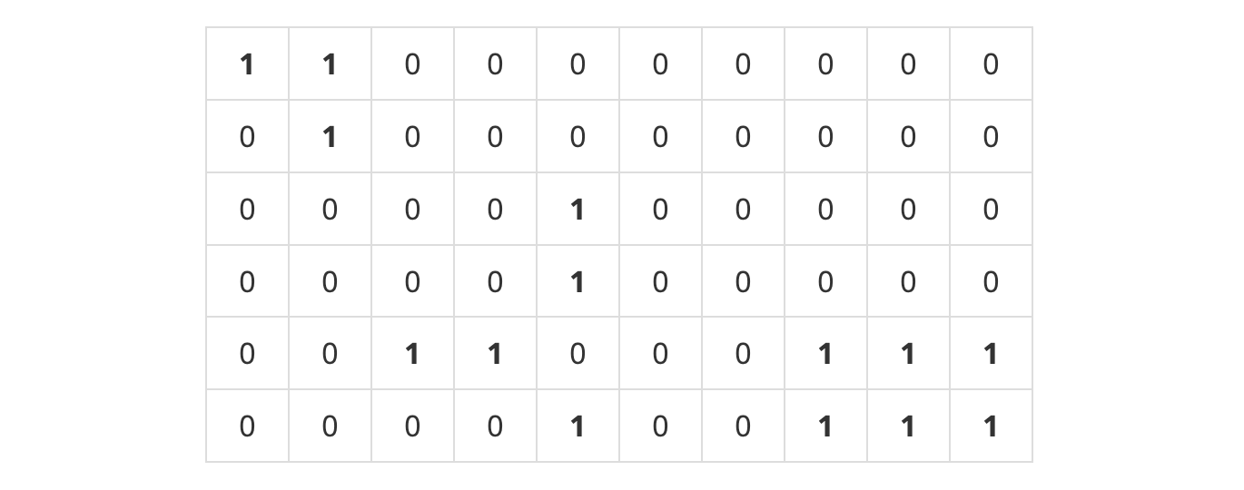 한나가 배추를 재배하는 땅은 고르지 못해서 배추를 군데군데 심어 놓았다. 배추들이 모여있는 곳에는 배추흰지렁이가 한 마리만 있으면 되므로 서로 인접해있는 배추들이 몇 군데에 퍼져있는지 조사하면 총 몇 마리의 지렁이가 필요한지 알 수 있다. 예를 들어 배추밭이 아래와 같이 구성되어 있으면 최소 5마리의 배추흰지렁이가 필요하다. 0은 배추가 심어져 있지 않은 땅이고, 1은 배추가 심어져 있는 땅을 나타낸다.