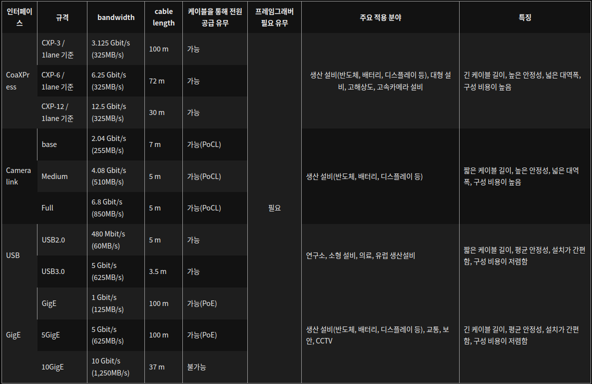 ๐ผ์ด๋ฏธ์ง 2. CXP, GigE, Camera Link, USB ์ธํฐํ์ด์ค ๋น๊ต