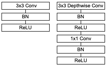 그리고 위 그림의 오른쪽과 같이 매 Depthwise Convolution과 Pointwise Convolution 뒤 Batch Normalization과 ReLU를 적용하여 학습 안정성을 높였습니다.