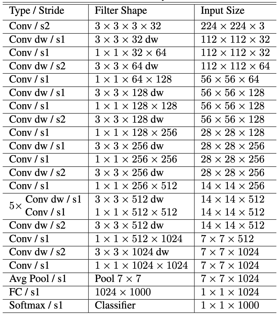 전반적인 MobileNet의 구조는 위와 같습니다.