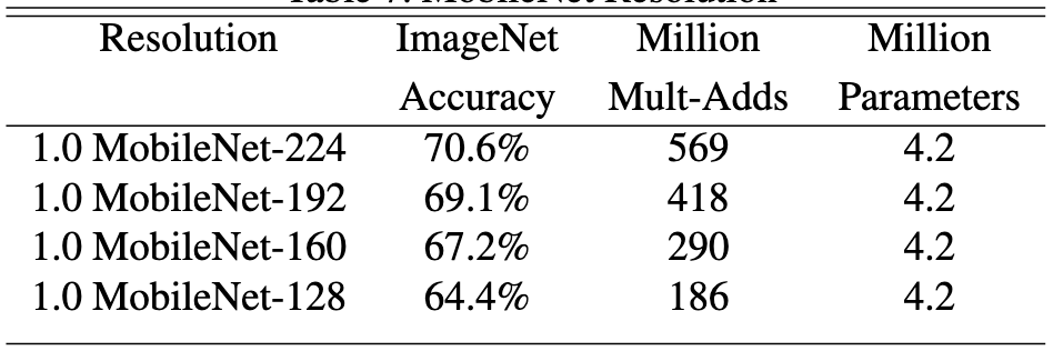 위 실험은 Resolution multiplier 에 변화를 주면서 정확도와 연산 비용에 어떤 변화를 주는지 살펴보기 위한 실험입니다.