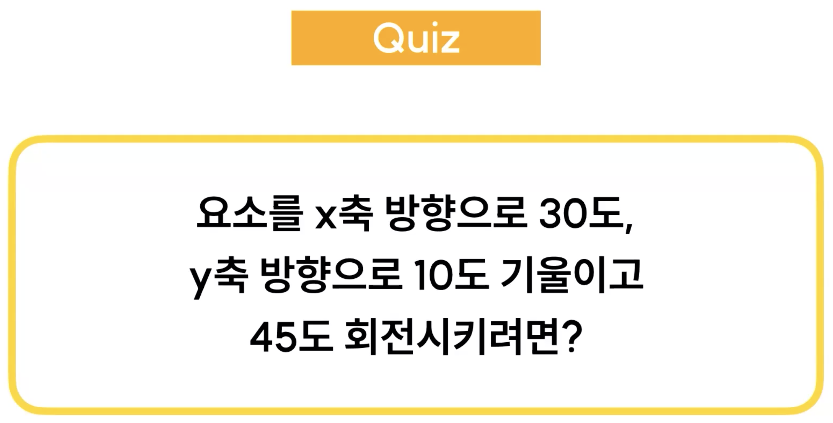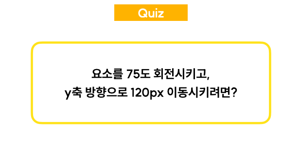 skewX(n) / skewY(n) 요소를 X or Y축으로 n도 만큼 기울여준다.rotate(n) 요소를 n만큼 회전시킨다.