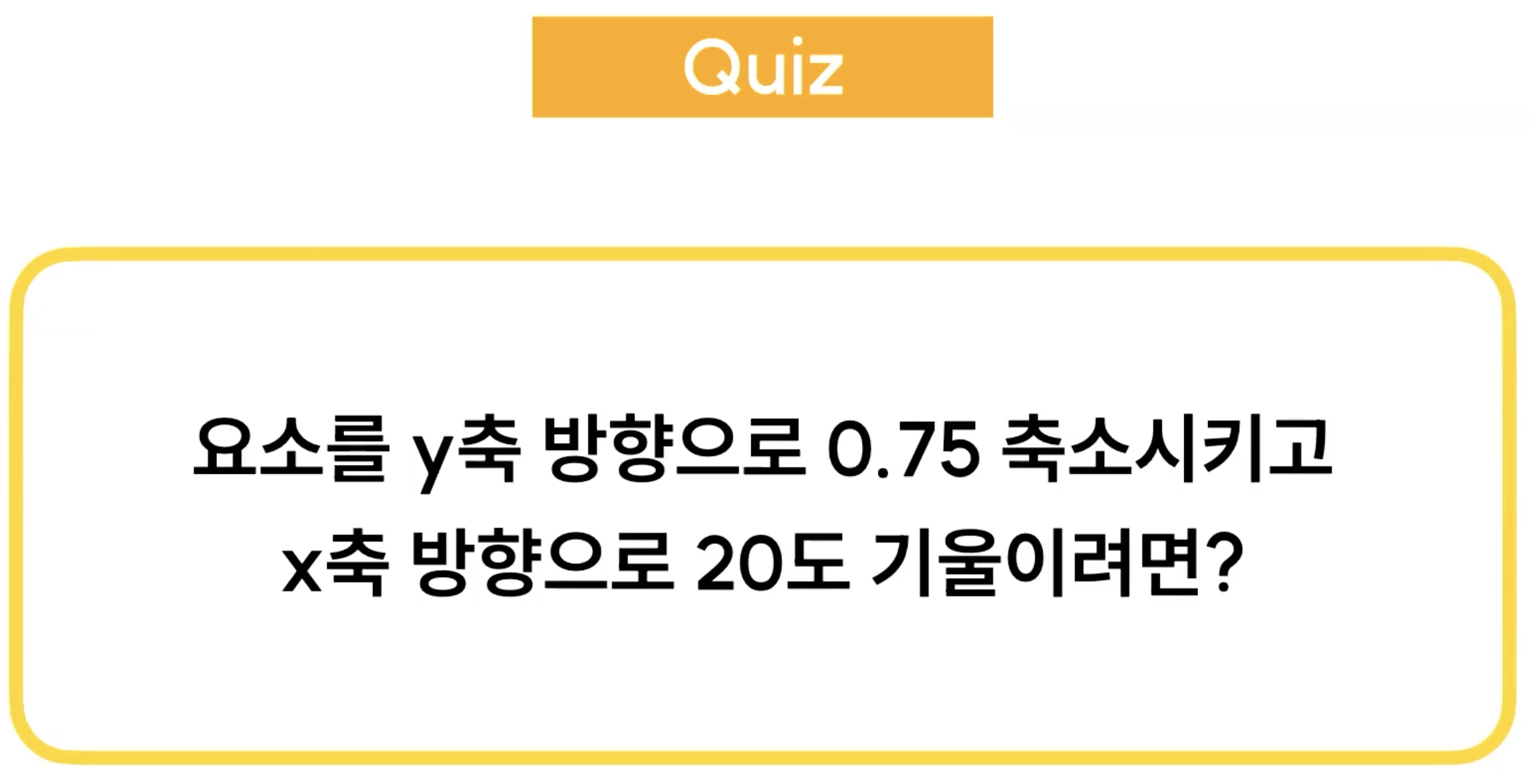 scaleX(n) / scaleY(n) x or y축 방향으로 n만큼 요소를 축소 혹은 확대skew(x, y) 요소를 기울여 마름모꼴처럼 만들어준다.