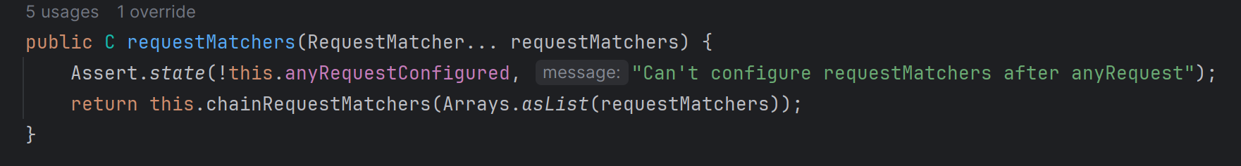 requestMacher method는 다음과 같이 여러개의 RequestMatcher를 받을 수 있도록 작성되어 있다.