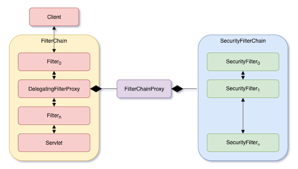 servlet container는 servlet container의 표준으로 작성된 servlet filter에 대해서는 instance를 생성할 수 있지만, spring context안에 있는, 즉 spring에 의해서 bean으로 등록되는 filter에 대해서는 servlet container가 filter로 인식하지 못한다. 이때 필요한 것이 delegatingFilterProxy이다. delegatingFilterProxy는 servlet container의 사이클과 Spring’s ApplicationContext 사이에서 연결고리가 되어준다. 표준 서블릿 컨테이너의 매커니즘을 통해 DelegatingFilterProxy를 등록하고, 내부 필터를 구현하고 있는 스프링 빈에게 모든 작업을 위임한다.