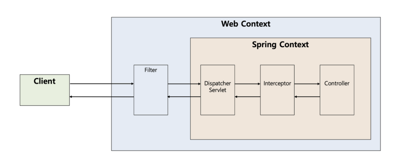 위 그림을 간단하게 살펴보면, client에서 서버로 http 요청을 보내면,해당 요청이 dispatcher servlet으로 넘어가기 전에 filter가 요청을 가로 챈다. 필터에서는 통과한 요청에 대해서만 Dispatcher Servlet에 해당 요청을 넘긴다. Dispatcher Servlet은 요청의 uri와 매칭되는 controller를 호출하여 요청을 전달한다. 대략적인 구조는 이러하다.