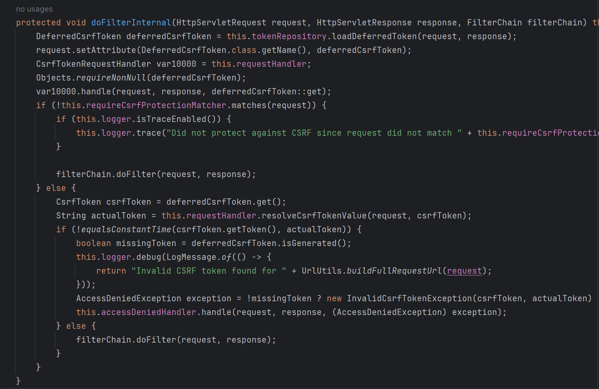CsrfFilter class의 doFilterInternal 함수를 살펴보자.