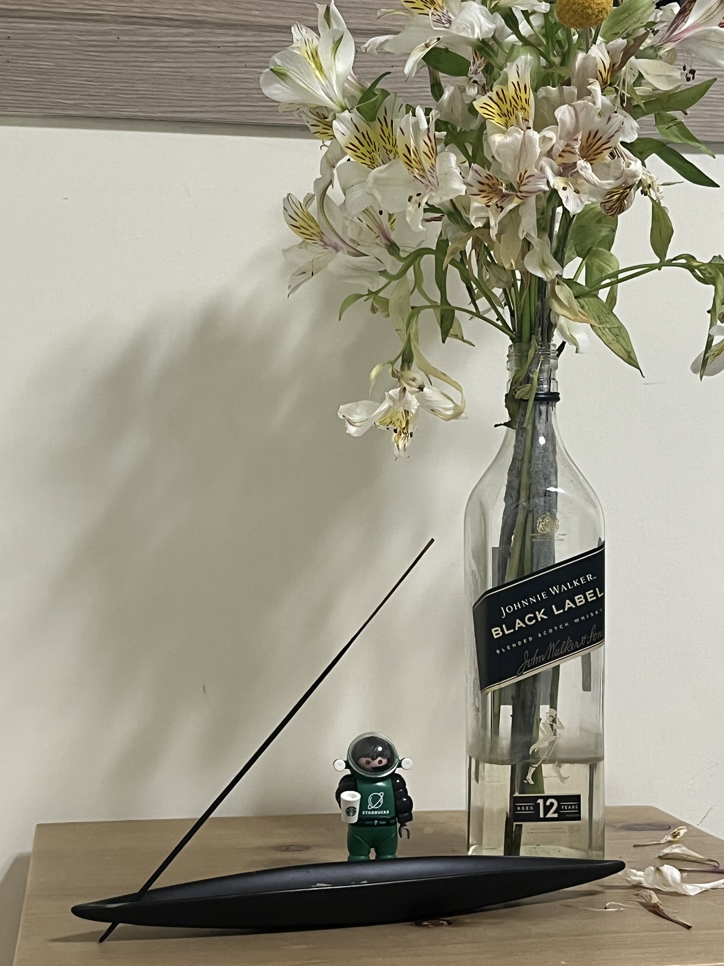 술을 좀 줄이겠다는 의미로 위스키병에 꽃을 꽂아봤다. 초록색 물체는 내가 제일 좋아하는 '스타우즈'다. 이사올 때 쓸쓸할 것 같아서 데려왔는데 데려오길 잘했다. 앞으로도 같이 잘 살아보자고 친구여.