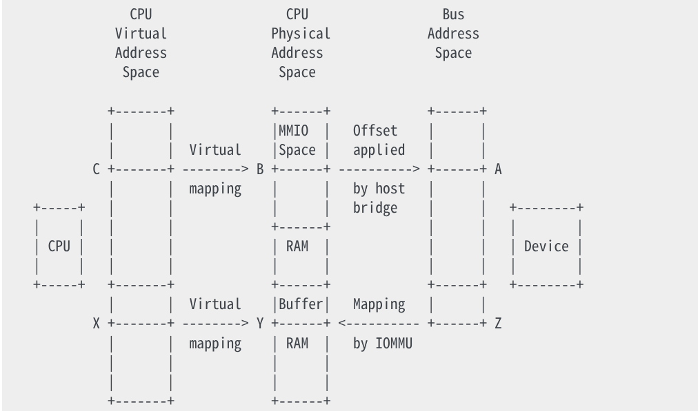 만약 장치가 DMA 를 지원한다면, 드라이버는 kmalloc() 과 같은 인터페이스를 통해 버퍼를 만들 수 있고 이는 가상 주소(X)를 반환한다. 가상 메모리 시스템은 X 를 시스템 RAM 물리 주소(Y)로 매핑한다. 드라이버는 가상 주소 X 를 통해 버퍼에 접근할 수 있으나, DMA 는 CPU 가상 메모리 시스템을 거치지 않기 때문에 장치 자체는 접근할 수 없다.
