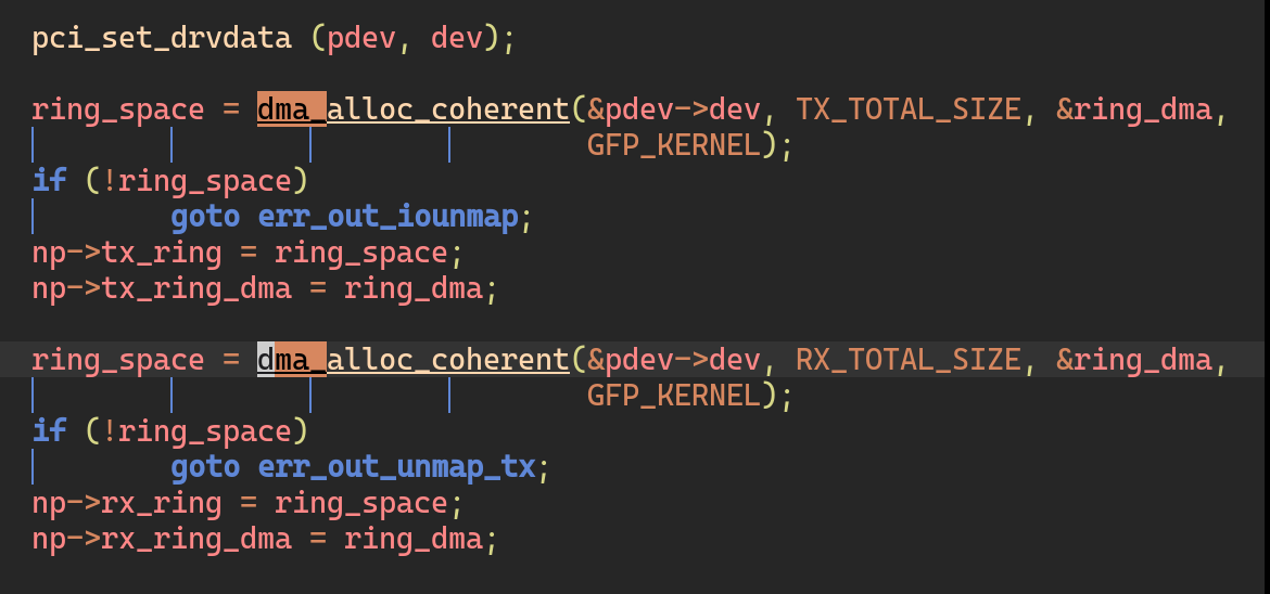 처음에 언급했던 것과 같이 일반적으로 coherent DMA 는 장치의 초기화 과정(rio_probe1()) 에서 이뤄지며, 예시에서 나왔던 것처럼 ring descriptor 를 초기화하기 위해 쓰였다.