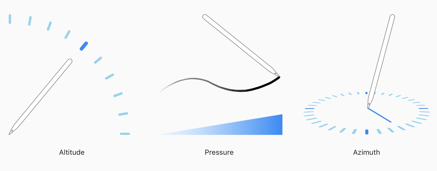 펜슬은 기울기 (고도) 힘 (압력) 및 방향(방위)를 감지할 수 있습니다.