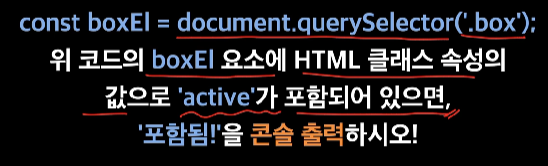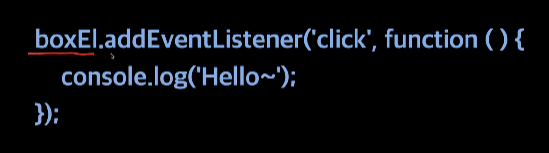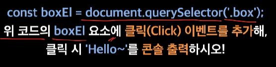 1) boxEl 에 클릭('click')하는 이벤트를 감지(.addEventListener)하는 첫 줄을 쓰고,