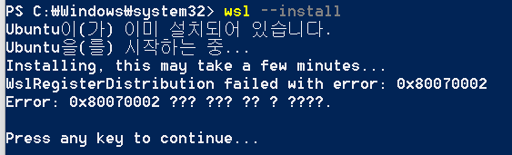 Docker를 사용하기 위해 wsl을 설치하는 과정에서 wsl 배포판을 찾지 못하는 에러가 발생했다. microsoft store에서 설치해도, 터미널로 설치해도 배포판을 실행하는 과정에서 계속 WslRegisterDistribution failed with error: 0x80070002 에러가 발생하여 우분투가 제대로 셋업되지 않았다. (Files not found error)